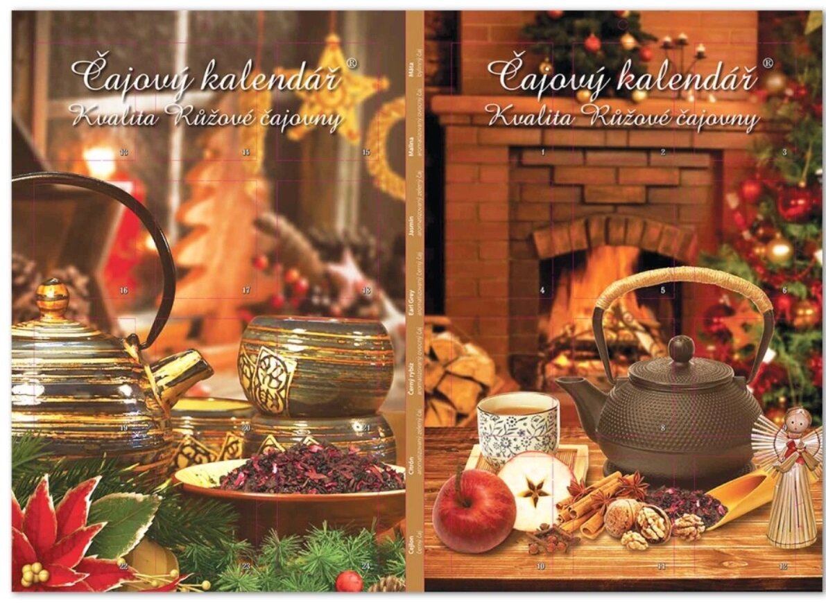 Originální čajová kolekce z naší vlastní produkce ve formě oboustranného adventního kalendáře, která obsahuje 24 ks porcovaných čajů – zkušenými čajovníky z Růžové čajovny vybraný mix nejoblíbenějších ovocných, zelených, černých, bylinných a oolong čajů. Čaje jsou umístěny v jednotlivých okénkách po obou stranách kalendáře tak, aby na každý den adventu připadl jeden lahodný nápoj.