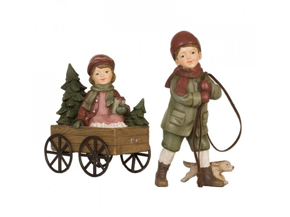 Sada dvou krásných figurek - chlapce a dívky s vozíkem. Vánoční figurky jsou skvělým doplňkem okenního parapetu, poličky, stolu, či jiného nábytku, kde se jistě budou nádherně vyjímat. Poslouží i jako příjemný dárek pro vaše blízké a přátele.