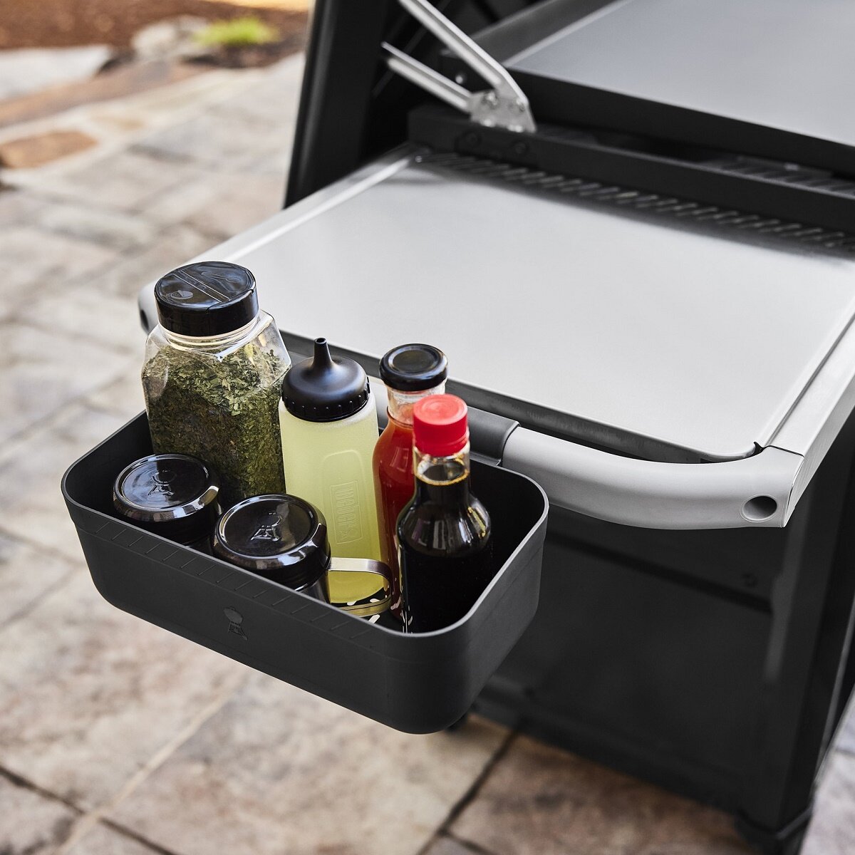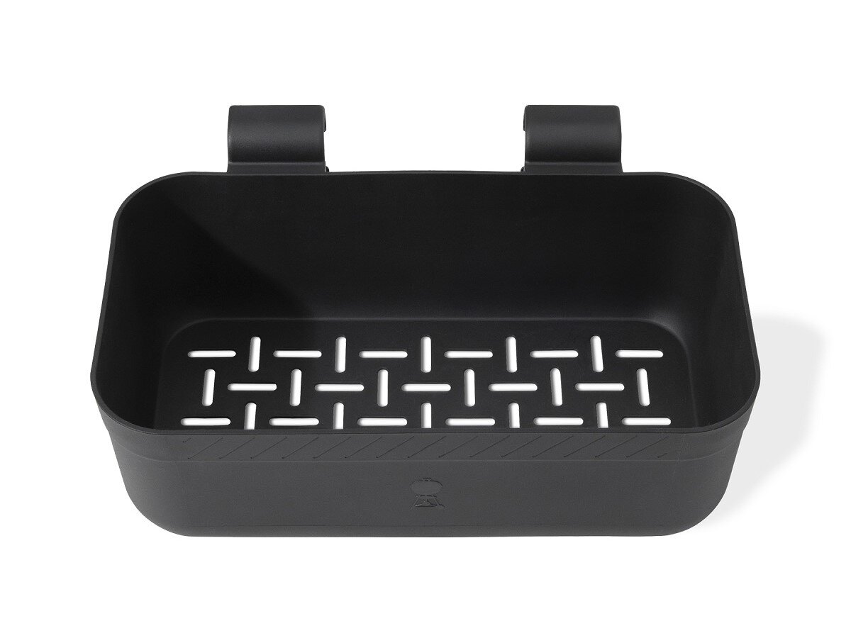 Košík na koření a omáčky, určený k připevnění nacvaknutím na lištu postranního stolku Weber Works. Držák zajistí grilovací koření a omáčky bezpečně na místě, nebudou Vám překážet a už se nestane, že si je při práci shodíte ze stolku pryč.
