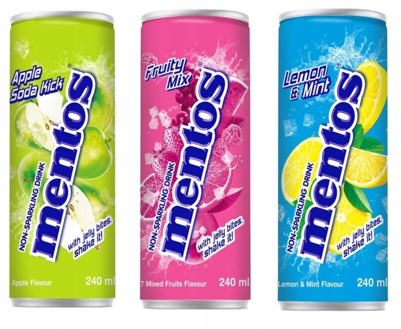 Limonáda Mentos s příchutí směsi 7 druhů ovoce obsahující kousky kokosového želé, nesycená. Obsah: 240ml