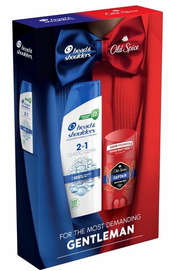 Darujte perfektní pečující sadu pro muže! Šampon Head Shoulders 2v1 Classic Clean chrání před lupy a deodorant Old Spice Captain udržuje svěžest po celý den. Je to duo, které si zamiluje každý muž!