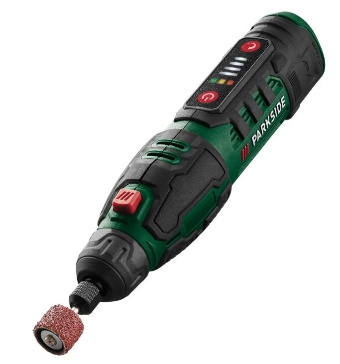 | Příslušenství: | 1x nabíjecí kabel USB-C (1,5 m), 1x upínací trn, 3x lešticí kotouč, 1x upínací trn pro brusná pouzdra, 4x brusné pouzdro, 1x válcový brusný nástavec (kámen), 1x brusný kotouč (kámen), 1x kovový kartáč, 1x upínací kleština (předmontovaná), 1x plastový kartáč, 1x frézovací nástavec (HSS), 1x gravírovací nástavec, 1x montážní nářadí, 1x leštící pasta |
