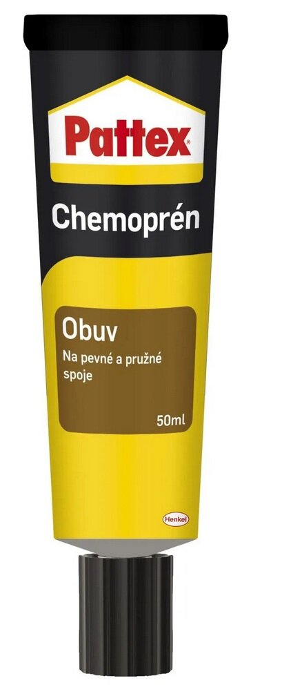 Lepidlo PATTEX Chemoprén Obuv je kontaktní lepidlo speciálně určeno na lepení a opravu obuvi, a to i sportovní. Vhodné je pro použití na všechny druhy svršků a podrážek, přičemž lepí a pevně spojuje širokou škálu materiálů, jako je kov, guma, kůže, koženka, korek, plst, textil, měkčené PVC, ABS, pěnové materiály i dřevo. Ideální je rovněž k lepení plastů o rozdílné tvrdosti typu PVC, polykarbonát, plexisklo či ABS. S lepidlem PATTEX Chemoprén spolehlivě opravíte boty. Po vytvrzení bude lepidlo transparentní, spoj zůstane vysoce flexibilní a odolný vůči vodě i rozpouštědlům.