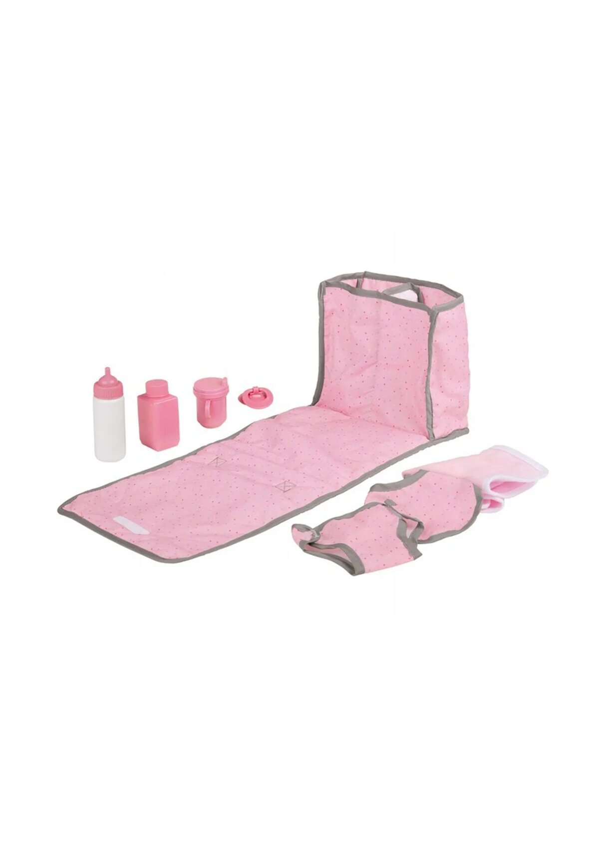 Taška na plenky s doplňky Příslušenství: 1x kosmetická taška, 1x bryndák, 1x přikrývka, 1x plenka, 1x láhev, 1x hrneček, 1x lahvička na pudr, 1x dudlík Rukojeť pro snadné přenášení Doporučený věk: pro děti od 2 let