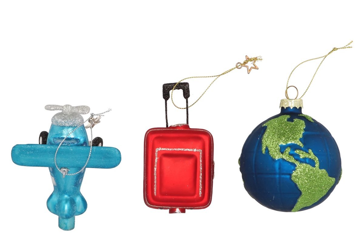 Stylová sada vánočních ozdob inspirovaná cestováním. Set obsahuje: