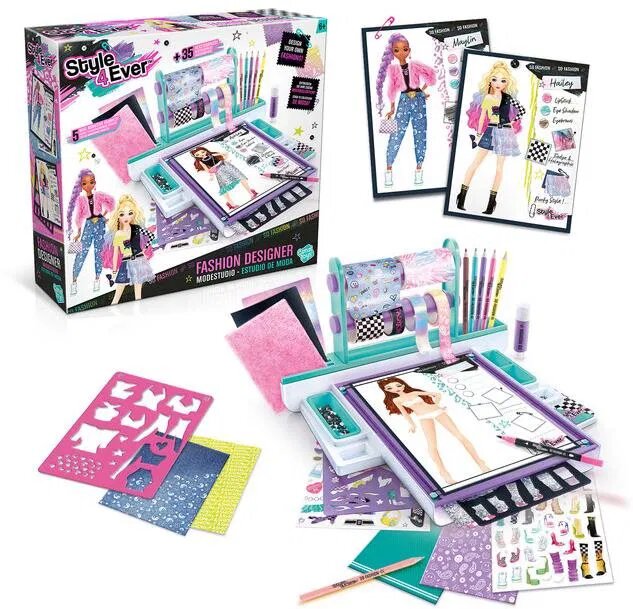 Kreativní sada Návrhářské módní studio značky Style4Ever přináší možnost tvořit vlastní módní návrhy a rozvíjet kreativitu. Děti mohou kreslit své návrhy volnou rukou nebo za pomoci šablon a poté je obohatit o realistické látky a doplňky. Součástí sady jsou vzorované návrhové a modelové listy, šablony, samolepicí látkové archy a kamínky, které dodají každému modelu jedinečný styl. Návrhářské módní studio Style4Ever je vhodné pro malé kreativce od 6 let.
