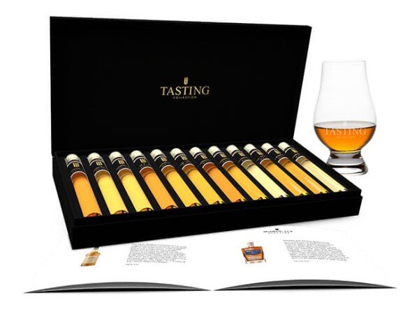 Luxusní degustační sada World Whiskies (set 2), balená v dárkové kazetě, obsahuje 12 skleněných zkumavek whisky o objemu 25 ml.