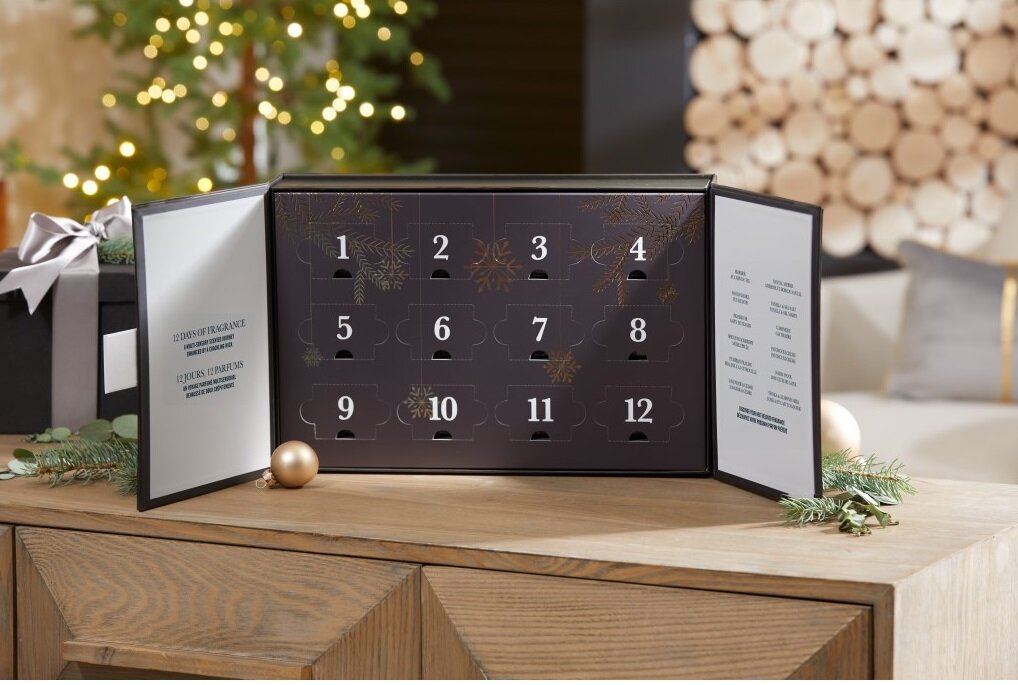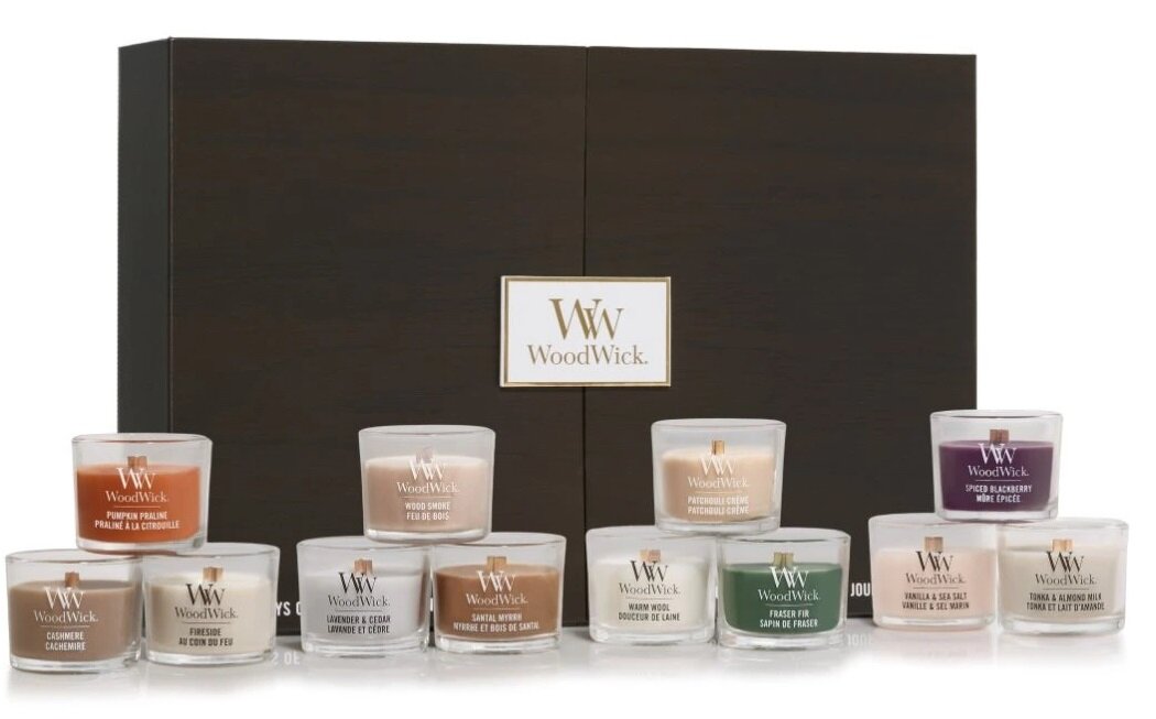 Obsahuje jednu votivní svíčku WoodWick v každé z následujících dvanácti vůní:Fireside, Fraser Fir, Wood Smoke, Spiced Blackberry, Pumpkin Praline, Lavender & Cedar, Santal Myrrh, Vanilla & Sea Salt, Cashmere, Patchouli Crème, Warm Wool, Tonka & Almond Milk